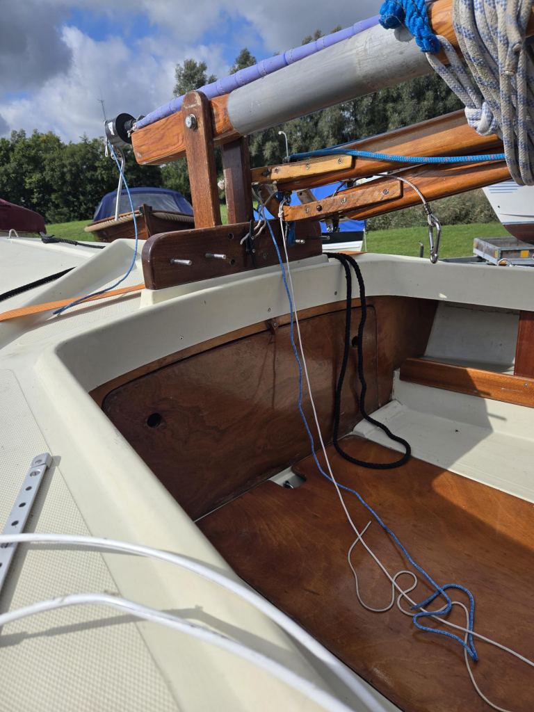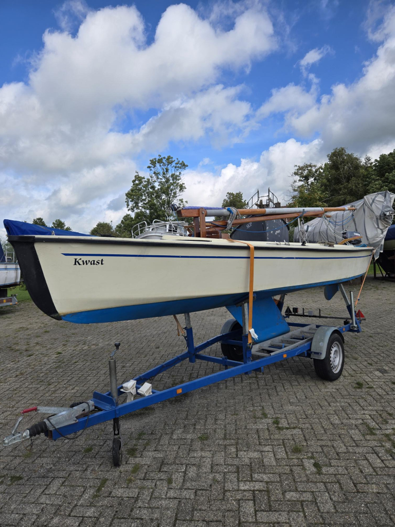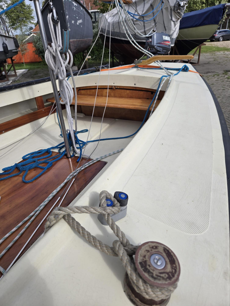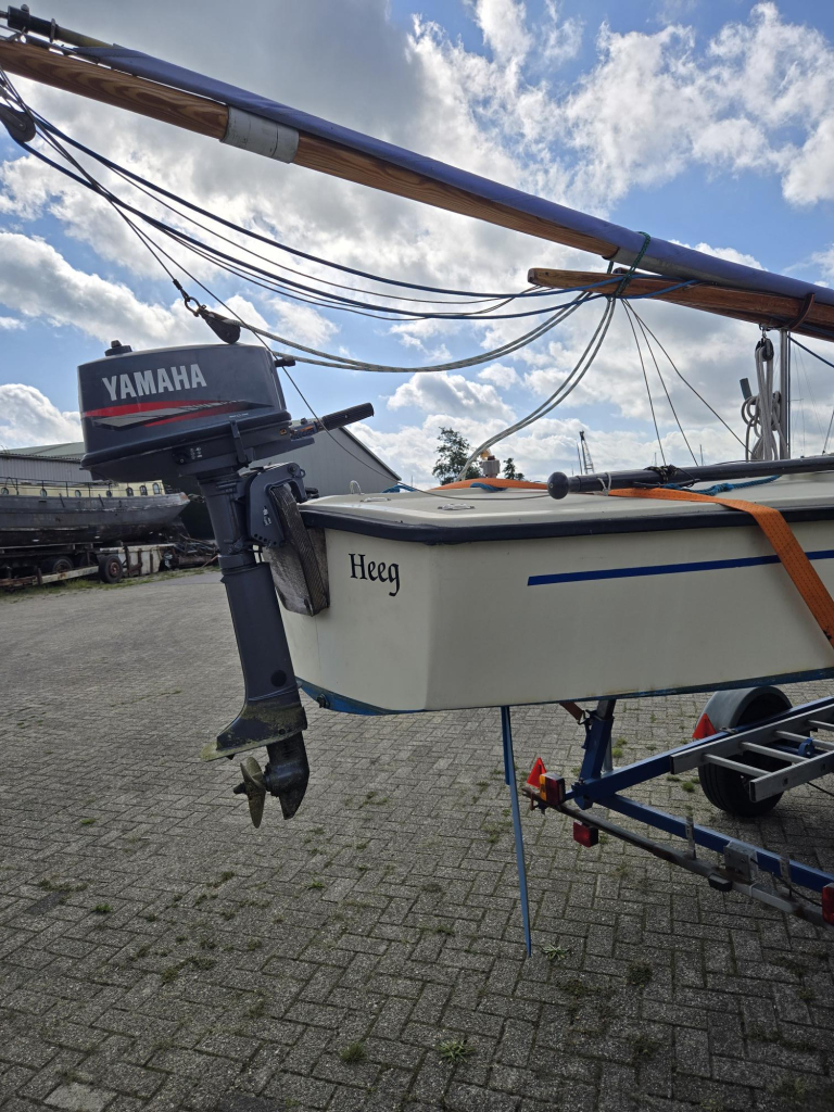 Nette polyvalk uit jaren 90 met o.a. geremde kielboottrailer incl papieren, 5 pk Yamaha langstaart motor incl externe tank, nieuwe dektent (2025), dubbele verstaging, houten rondhouten, rolfok met UV baan uit 2015, grootzeil. Houtwerk in prima conditie.