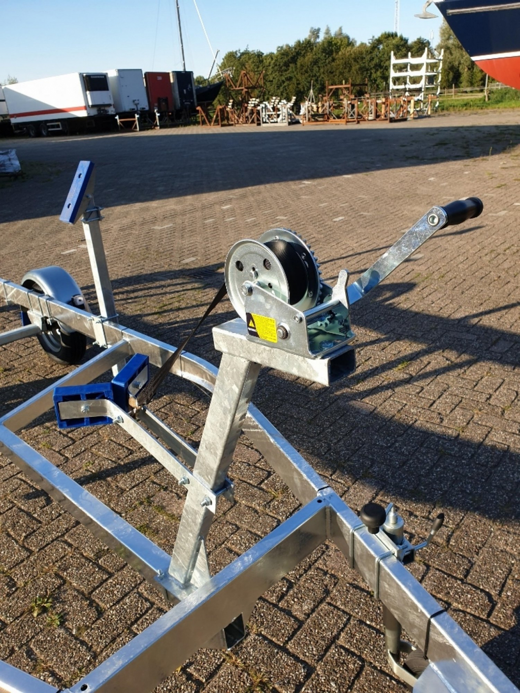 Deze zeilboot trailer wordt standaard geleverd met: - 4x kunststof stempels, instelbaar in hoogte & breedte - verstelbare Knottas van 1.350 kg met waterdichte lagers - kielsteun van slijtvast kunststof - wielmaat van de trailerbanden is 13 inch en 155 centimeter breed. Deze banden hebben een draagvermogen van 400 kilo per stuk of naar keuze kan de trailer voorzien worden van 8 inch “Ballon” banden met een draagkracht van 425 kilogram. - High Quality neuswiel met rubberband - uitschuifbare stalen lichtbalk voorzien van 11 polige stekkerdoos, 2 RVS kentekenplaat houders plus degelijke achterlichten - LED verlichting zijkant trailer - bedrading weggewerkt in frame - ogen (4x) voor sjorbanden - CVO verklaring (COC) - frame trailer is volledig verzinkt (binnen & buiten) - de robuust uitgevoerde dissel is volledig verzinkt en bestaat uit een koker van 60 millimeter x 60 millimeter met een dikte van 3 millimeter. En bij de montage van de koppeling zijn bussen ingelast.